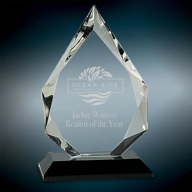 8" or 10" Diamond Crystal on Black, Blue or Clear Pedestal Base Each piece is handmade, so size may vary slightly. FREE DESIGN CONSULTATION, FREE PROOFS (MAX 3), FREE ENGRAVING, FREE SHIPPING