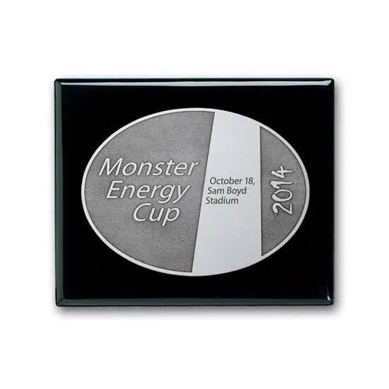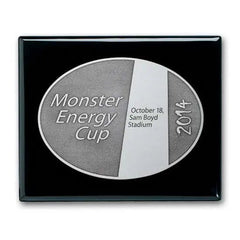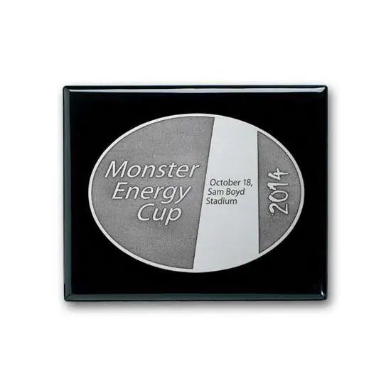 The Double Etched process creates a deep recessed contrast and gives the background a rich, antique look that can be colorfilled (inquire for price) or left a natural dark brown/black on a gold or silvertone plate mounted to our ebony piano finished wood plaque.