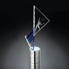 Cobalt, azure and amethyst crystal is embedded at angles to blur the edges and redefine crystal art with abstract color. The Empyrean sculpture is mounted to a silver finish cast metal base (base imprint included in price) and shown with an optional crystal deep etched imprint.