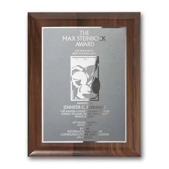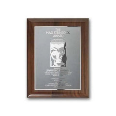 The Etched & Frosted process adds a soft frosted background and brightly polished raised areas for an elegant diamond cut look on a gold or silvertone plate mounted to our walnut piano finished wood plaque.