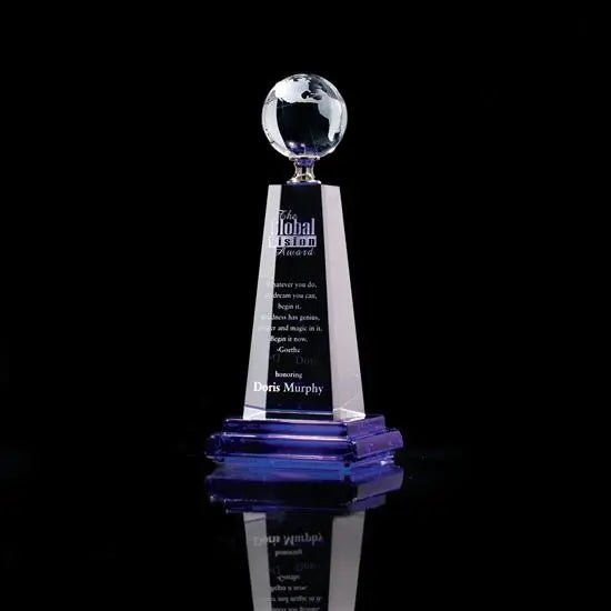 Optical crystal gives radiance and sparkle to these global awards topped with an etched crystal world. The unique Global Vision features cobalt and clear optical crystal with a silver pedestal for a dramatic flair. |