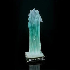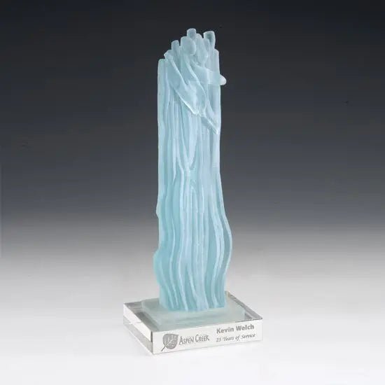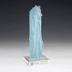 Master recycled glass artist Michael Tonder employs internal lines with intricate surface textures using light reflection, refraction and diffusion to create these amazing and unique awards. ||The glass that makes up this artwork is 100% recycled and made in the USA. The glass is salvaged from buildings that are being renovated or torn down. This exciting new art form starts with many glass pieces which are fused together and then slumped and textures to create this stunning collection that resembles beach glass. ||The optical crystal base is not made in America. We chose this base for its amazing reflective properties, however if a 100% American made award is desired, we can source other bases. Please ask your customer service representative for other options for base products.||