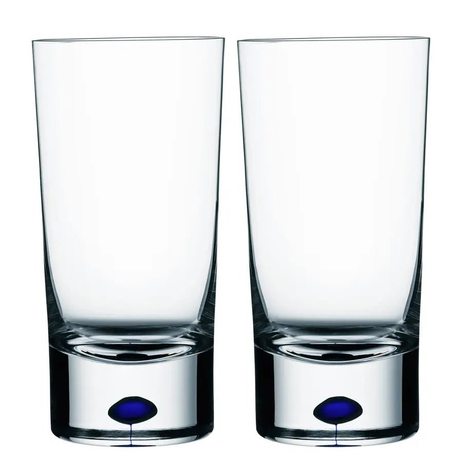 Intermezzo Tumbler/Juice from Orrefors was designed in 1984. The glass, available as a set of 2, holds 9 oz and is intended as a smaller highball glass for juice and other non-alcoholic beverages. Intermezzo Tumbler/Juice is mouthblown in Sweden by expert glassblowers and has a drop of blue sealed in the bottom – an innovation based on traditional glass craftsmanship. Designed by Erika Lagerbielke.