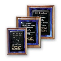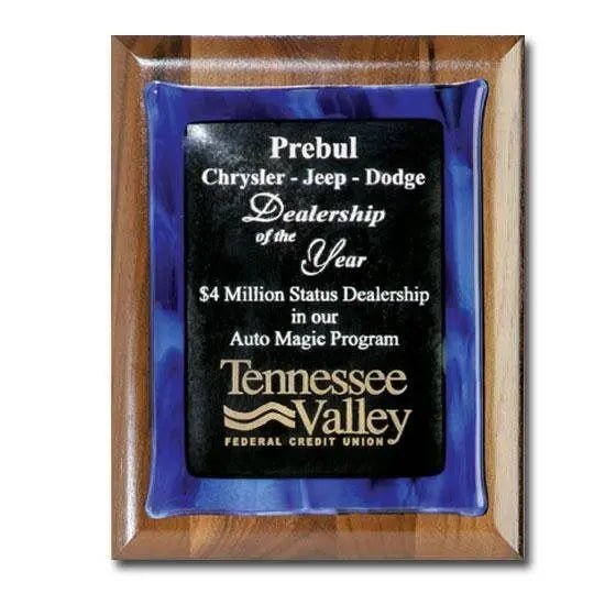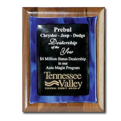 Metallic Fusion is formed using metallic gold and silver along with trendy new art glass colors to bring a fresh look to wall plaques. This collection shown here uses silver metallic centers with blue marble art glass mounted on walnut plaques with rolled edges. ||Art glass is Made in America.