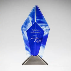 Fused art glass in shades of cathedral topaz & sapphire or clear with black stringers are combined with metallic gold and cobalt centers and mounted to a satin nickel cast metal base creating a colorful award of exceptional beauty