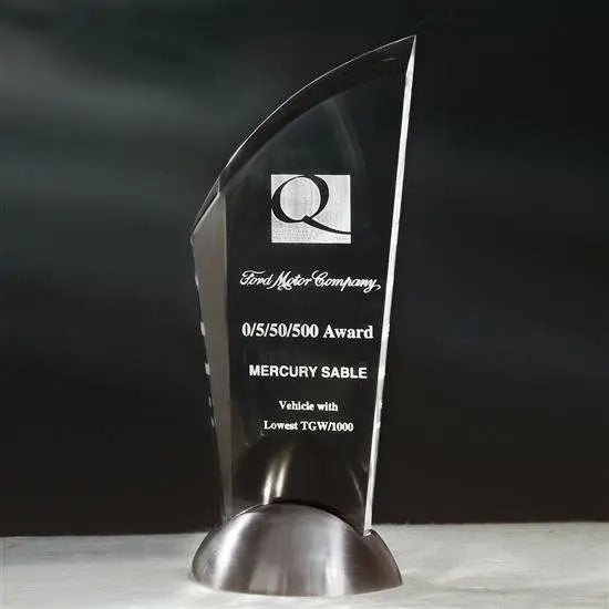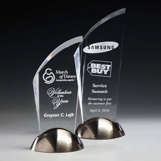 The double beveled acrylic of the Stylus Award is mounted deep in the recessed cast metal satin nickel finished base to give your accomplishment contemporary flair with sparkling clarity. .