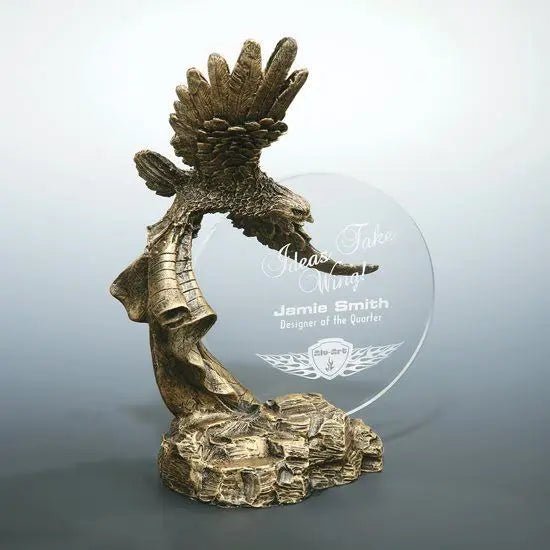 Swooping majestically down over the rocky terrain, the eagle and the flag it carries effortlessly frames the circular namepiece. Inspired by the setting sun, this award is sure to inspire others.