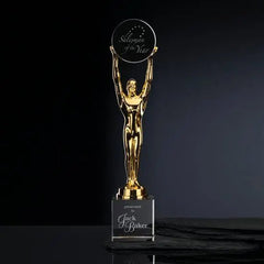 Create your own symbol of Achievement with this figure ready to hold anything from a custom medallion to a product replica. Let your imagination be your guide. Since the empty arms have to hold something, the figure comes standard with your imprint deep etched on a crystal disk and optical crystal base.|