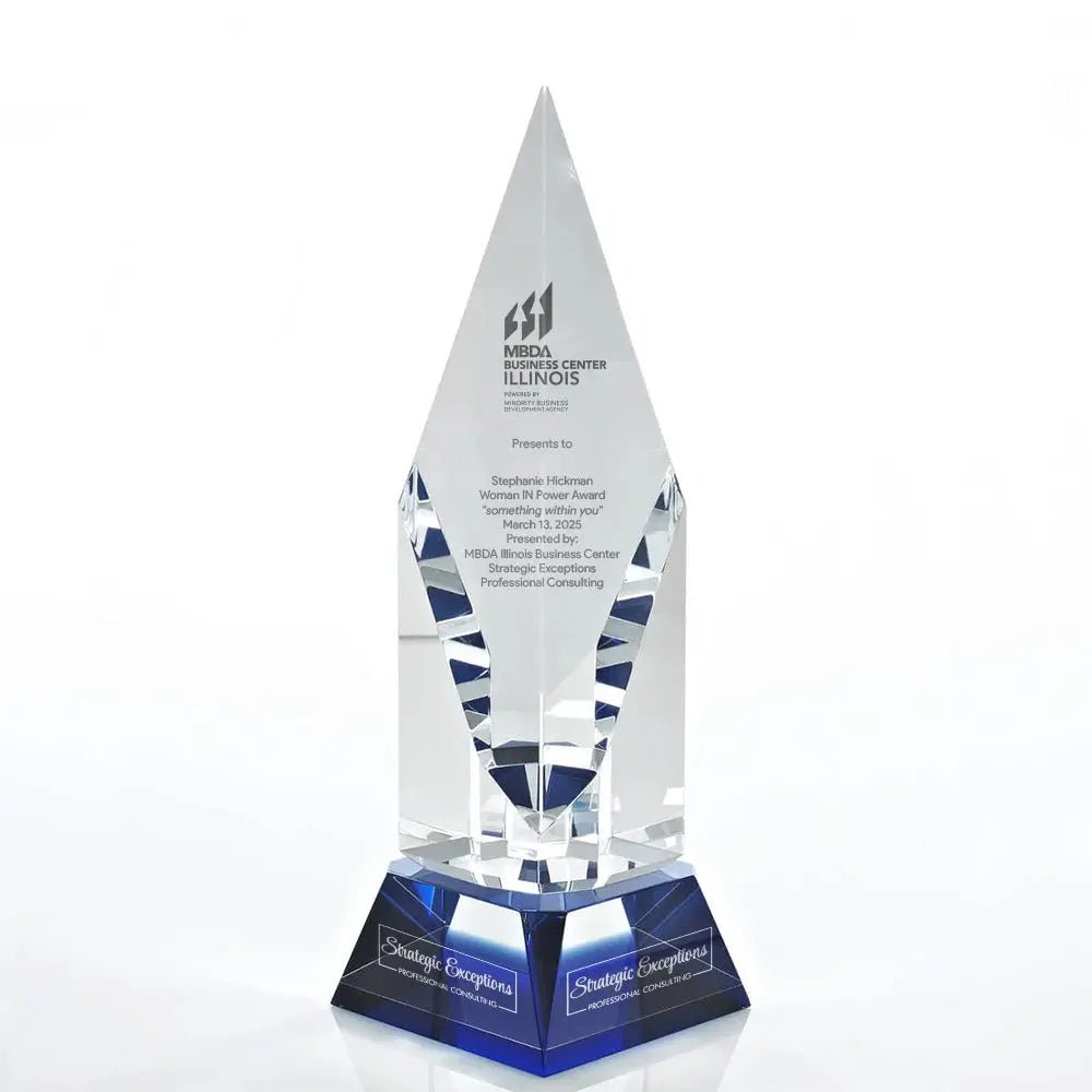 The towering Optical Crystal Vertex Award features a large diamond that is sheered off the top of a large rectangular pillar and mounted on a tapered Sapphire Optical Base. A magnificent Crystal Trophy to recognize and inspiring achievement.