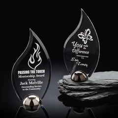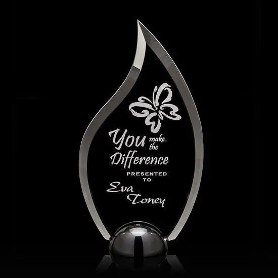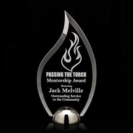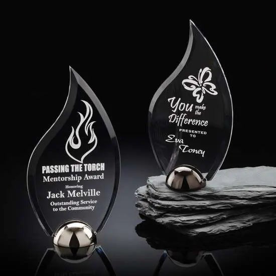 The beveled flame of the Vulcan Hemisphere Award is combined with a domed hemisphere base, available plated in either bright or black nickel, to create this classically styled acrylic award.